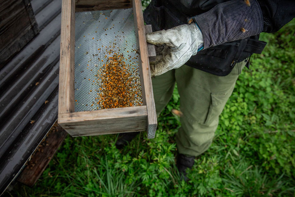 豪さんが巣門の前に仕掛けた花粉採り装置から底が金網になっている引き出しを抜くと、オレンジ色や黄色、焦げ茶色の花粉団子がこんもりと積み上がっている。