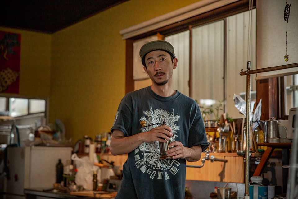 豪さんが自宅台所でコーヒーを淹れようとしている