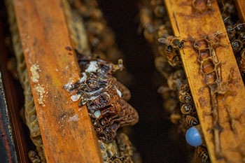 次の巣箱では「2枚目にできていた王台なので、花マル王台なんで、大丈夫です」と、頷く。豪さんが認めた花マル群があって、その群から移動した蜂児の巣板には血統に対する信頼があるようだ。「蜜をいっぱい集める群なんです。でも、(採蜜のための)継ぎ箱にはしないで、予備箱というか卵の補充群として置いてあるんです。蜜をたくさん集めるかどうかは、女王蜂の血統によるんで……。この花マル群から3週間前に一度は卵の巣板を抜いたんですけど、日数が経っているんでもう一枚抜けるんじゃないかと思って……。調子の良い1軍、ノーマルな2軍、調子の良くない3軍があれば、3軍は必ず1軍から助けを出して全体が同じレベルになるように調整していますね。群勢にバラツキがあると管理しにくいので……」
