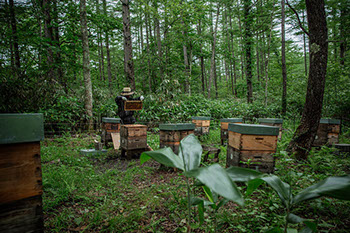 戸隠蜂場のある国有林には、トチやウワミズザクラ、ボダイジュ、キハダ、イタヤカエデなどの広大な自然林が広がっている。その一部にカラマツの人工林があり、その一角を切り拓いた広場が豪さん自慢のトチ蜜を採る戸隠蜂場だ。「毎回、ここに来る時は熊にやられていないかドキドキしながら来て、巣箱が倒れていなければ良かったって感じですよ。遠くからでもガサガサとかバサッと音がしたら、熊ですから。ここら辺は熊だらけですから」。燻煙器を準備しながら豪さんが教えてくれる。