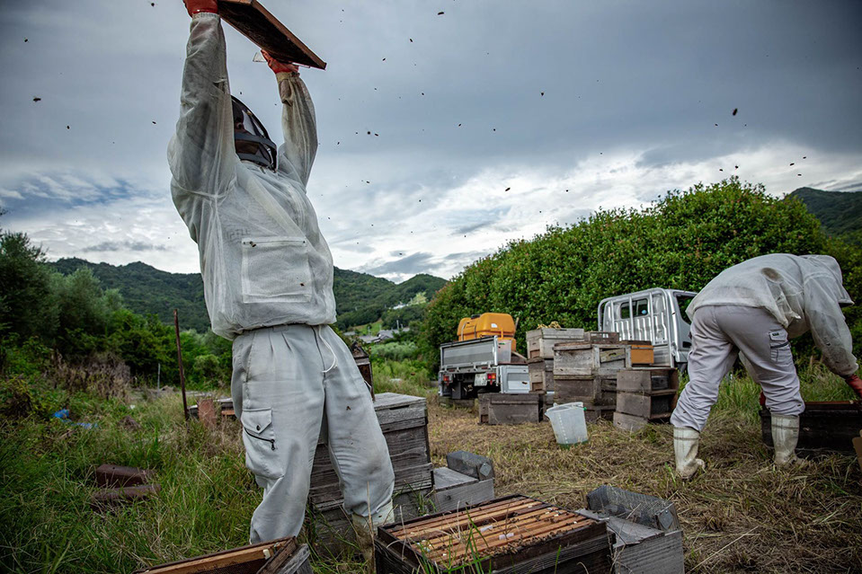 緩やかな傾斜地に広がるミカン園の一区画に巣箱を置いた朝日蜂場で、作業の手を休めて吉田能國養蜂場を営む吉田桂吾(よしだ けいご)さん(45)が、この日の作業内容を説明する。内検作業は妻の朱里(あかり)さん(44)が一緒だ。もう1人、桂吾さんとは20年来の友人である武智哉(たけ ともや)さん(45)は、養蜂の作業が忙しい5月から8月までの期間、自宅のある神奈川県から手伝いに来てくれている。今年は、桂吾さんの体調が思わしくないことや作業が遅れているため「例年より長い期間手伝うことになりそうだ」と、武さん。