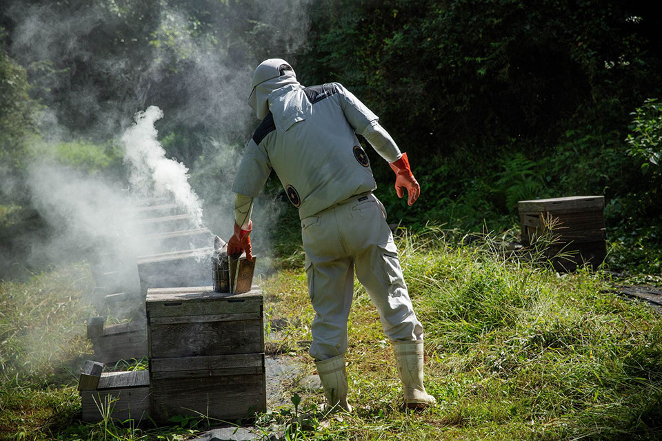 桂吾さんがハウスから戻ってきた巣箱の内検を始めようとしている
