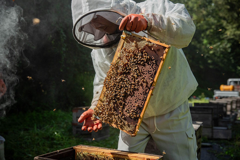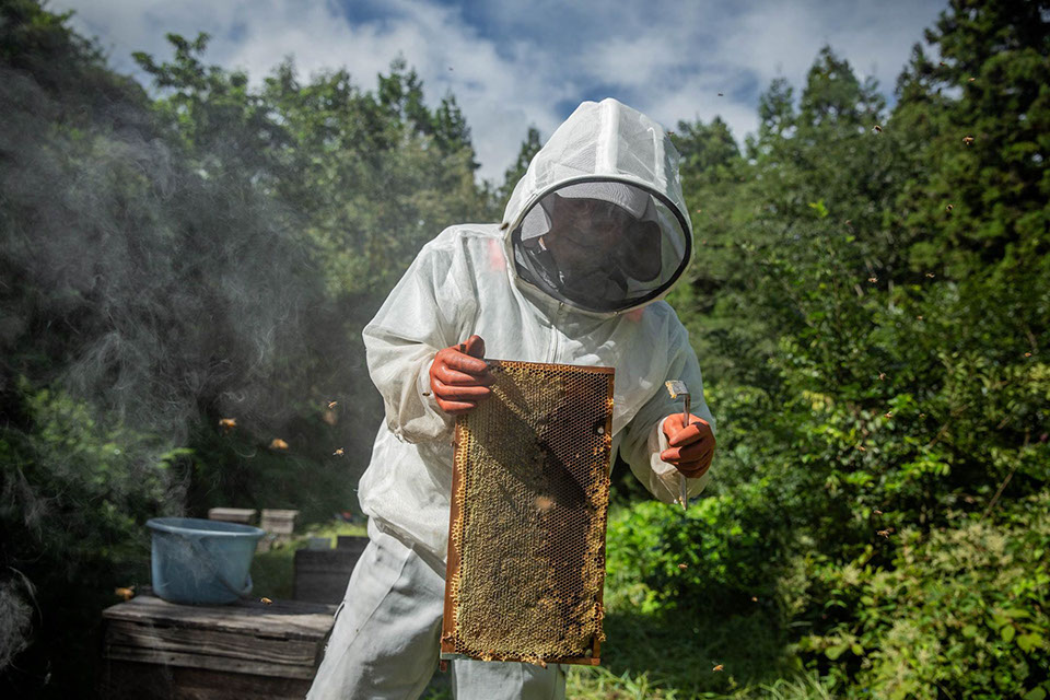 最初の継ぎ箱の蓋を開け、1枚目巣板を持ち上げた桂吾さんが「わっ」と小さな声を出した後、何ごともなかったように作業を続け、たっぷりと蜜が溜められている蜜巣板を持ち帰るため、武さんへ手渡している。作業が一区切り付いた時、桂吾さんに「わっ」と声を出したのは何故かと尋ねた。桂吾さんは声を出したことを意識していなかったようで、状況を思い返しながら「(卵はある筈のない)継ぎ箱の巣板に卵が産み付けてあったからだと思うけど……」と言う。継ぎ箱には、本来、蜜を溜めるための巣板を入れてあるので、そこに卵があることは変則的だが、下の単箱に入れてある巣板が、卵や蜂児で一杯になったためなので、蜂群に勢いのある証しでもある。実際、桂吾さんが継ぎ箱から引き抜く蜜巣板のほとんどが蜂蜜で一杯になった状態だった。昨日の朝日蜂場の状態を思い返すと、大きな違いだ。