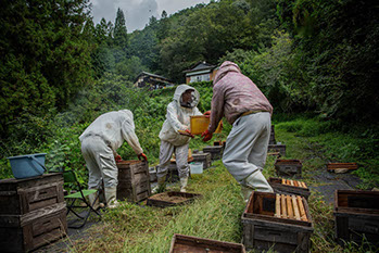 こうして始まった桂吾さんの養蜂業だが、能國さんの体力の衰えが顕著になっていくのを見過ごすことはできなかった。そのことを桂吾さんは「成りでやっているだけ」と言っているのだ。又、桂吾さんは「情熱を持って始めた訳じゃない」とも言っていた。どうやら桂吾さんは照れ屋なのかも知れない。そんなところが能國さんとも気が合ったのだと思う。というのは、朱里さんが能國さんの若い頃にミカン農家の研修に行った時の写真を私に見せて「どれが父だと思いますか」と聞く。「親分肌だった」とか「地域や人の世話をするのか好きだった」と聞いていたので、8人ほどがミカン畑で並んでいる中央の男性を指さすと、朱里さんは首を横に振る。結局分からず仕舞いで教えてもらうと、後ろの列の端っこでちょっと控えめに座っている男性だった。意外とシャイな人だったようだ。聞いていた豪傑タイプの人物像とは異なっていたが、だからこそ桂吾さんとは気が合ったのかも知れない。