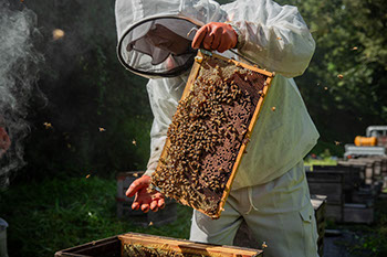 桂吾さんがハウスの交配に貸し出していた巣箱の内検をする。蜜で満杯になった巣板を手にする