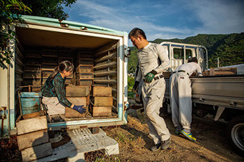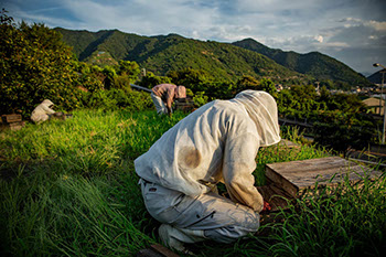午後5時過ぎ、一旦作業場に戻った桂吾さんたちは休む間もなく、曽保地区内に置いてある巣箱にスズメバチの捕獲器を取り付けに向かった。小高い丘の蜂場からはすぐ近くに瀬戸内海が見えている。