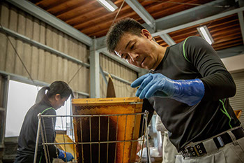 大きな作業場の奥に遠心分離機が据え付けてあり、その傍に蜜巣板の蜜蓋を切る台が3台設置されている。桂吾さんと朱里さん、それに武さんの3人が同時進行で蜜蓋切りをするということなのだ。それぞれが巣箱から蜜巣板を取り出して蜜蓋切り台に置くと、左官が壁を塗る際に使うコテのような形をした刃物で蜜蓋を切っていく。3人の真ん中に湯が沸かしてあって、一作業ごとに蜜蓋切り刃を湯に入れて蜜が絡んで鈍くなった切れ味を戻している。3人共、蜜蓋切りが丁寧だ。小さな蜜蓋の屑も残さない。