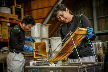 きっちりした役割分担はなさそうだが、遠心分離機に蜜巣板を入れ、搾り終わったら取り出すのは朱里さんで、一斗缶に溜めた搾った蜂蜜を大きな貯蔵タンクに入れるのは桂吾さんの役目のようだ。