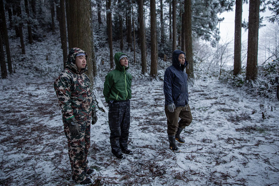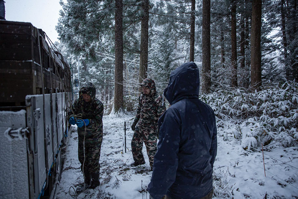 4トントラックをバックして荷台を杉林の根元に置いてある巣箱の近くまで突っ込んでいく。停車すると、利憲さんがトラックの荷台に飛び乗り巣箱を積み込む準備を始めた。それと同時に、弟の憲二(けんじ)さん(53)と迷彩服姿の長男の竜馬(りょうま)さん(23)を始め、2か月前から平養蜂場の従業員として働き始めた利憲さんの同級生、川村真悦(かわむら しんいち)さん(54)と「巣箱を移動する時にだけ手伝いに来ている」と言う中村十見男(なかむら とみお)さん(78)が、薄らと雪の積もった蜂場に大股で歩いて入って行く。すると、間もなく憲二さんがワゴン車へトンカチを取りに戻って、巣箱の巣門辺りをトントンと軽く叩き始めた。「閉まんねえ」と呟く。移動させるために巣門を閉めようとしても、凍り付いていて閉まらないのだ。「一番外れの日を引いた」と、ぼやきながら竜馬さんが巣箱の上に薄く積もった雪を箒で払っている。継箱(2段巣箱)は前もってロープで縛ってあったので、トラックの荷台まで運べば、この朝の作業は終わる。誰もが、ただ黙々と巣箱を胸に抱え、あるいは腰に載せ背中で負うようにして運んでいる。