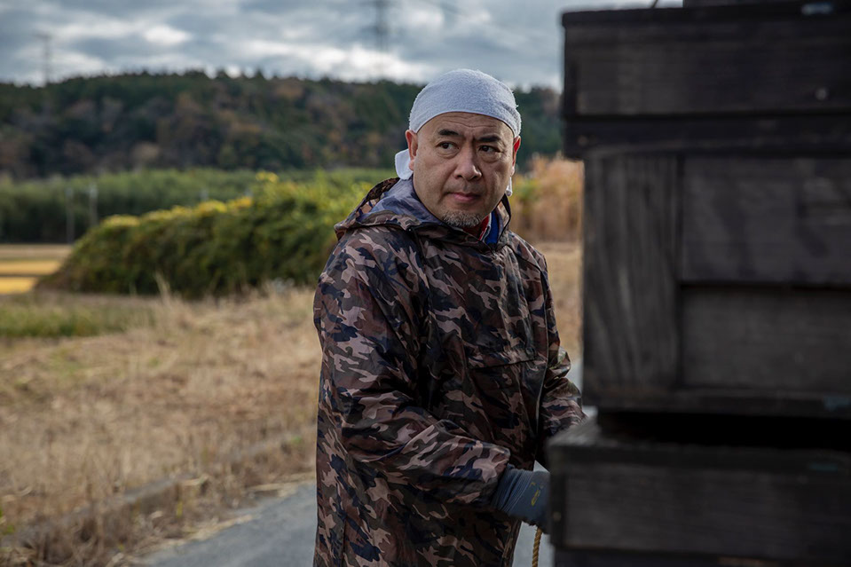 厳しい表情で巣箱の積み替えを指示する利憲さん