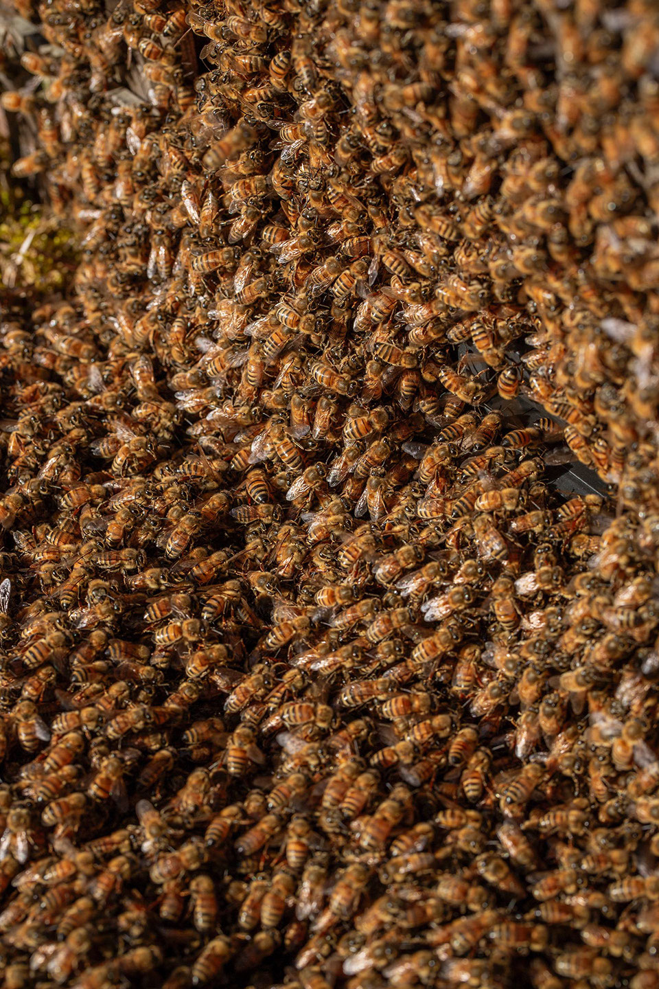 巣板から払われた蜂が巣箱に戻ろうと巣門に密集する