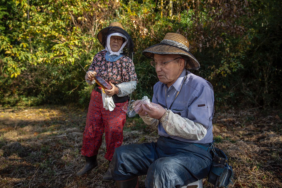 蜜の溜まった巣板を選んでいる時の2人の会話。長年、二人三脚で蜂の世話をしてきた利一郎さんと葉子さん夫妻の阿吽の呼吸が伝わってくる穏やかな時間だ。