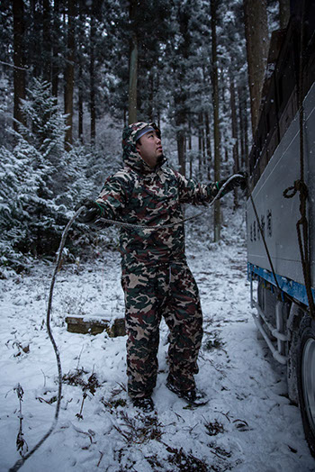 4トントラックをバックして荷台を杉林の根元に置いてある巣箱の近くまで突っ込んでいく。停車すると、利憲さんがトラックの荷台に飛び乗り巣箱を積み込む準備を始めた。それと同時に、弟の憲二(けんじ)さん(53)と迷彩服姿の長男の竜馬(りょうま)さん(23)を始め、2か月前から平養蜂場の従業員として働き始めた利憲さんの同級生、川村真悦(かわむら しんいち)さん(54)と「巣箱を移動する時にだけ手伝いに来ている」と言う中村十見男(なかむら とみお)さん(78)が、薄らと雪の積もった蜂場に大股で歩いて入って行く。すると、間もなく憲二さんがワゴン車へトンカチを取りに戻って、巣箱の巣門辺りをトントンと軽く叩き始めた。「閉まんねえ」と呟く。移動させるために巣門を閉めようとしても、凍り付いていて閉まらないのだ。「一番外れの日を引いた」と、ぼやきながら竜馬さんが巣箱の上に薄く積もった雪を箒で払っている。継箱(2段巣箱)は前もってロープで縛ってあったので、トラックの荷台まで運べば、この朝の作業は終わる。誰もが、ただ黙々と巣箱を胸に抱え、あるいは腰に載せ背中で負うようにして運んでいる。