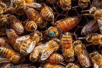 見付けやすくするため女王蜂の頭にマーカーで印を付ける