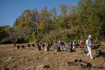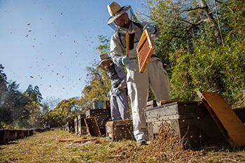 暖かい日射しが注ぐ千葉県の蜂場で内検が続く