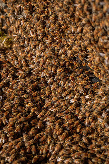 「今日みたいな穏やかな日が明日まで続けば、蜂はもっと落ち着くんだけど、昨日の今日でしょう。まだ落ち着いてないね」と利一郎さん。確かに、巣門の前で払われて地面に落ちた蜂は一斉に巣門を目指して移動を始めているが、空中には方向性が定まらない無数の蜂が羽音を立てて乱れ飛んでいる。
