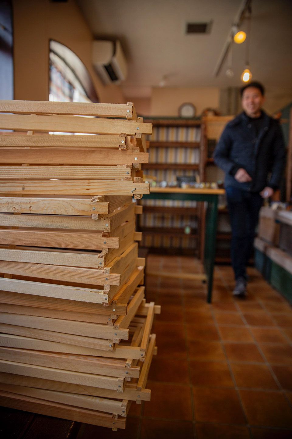 組み立て途中の巣枠が店内に重ねて置かれてあった