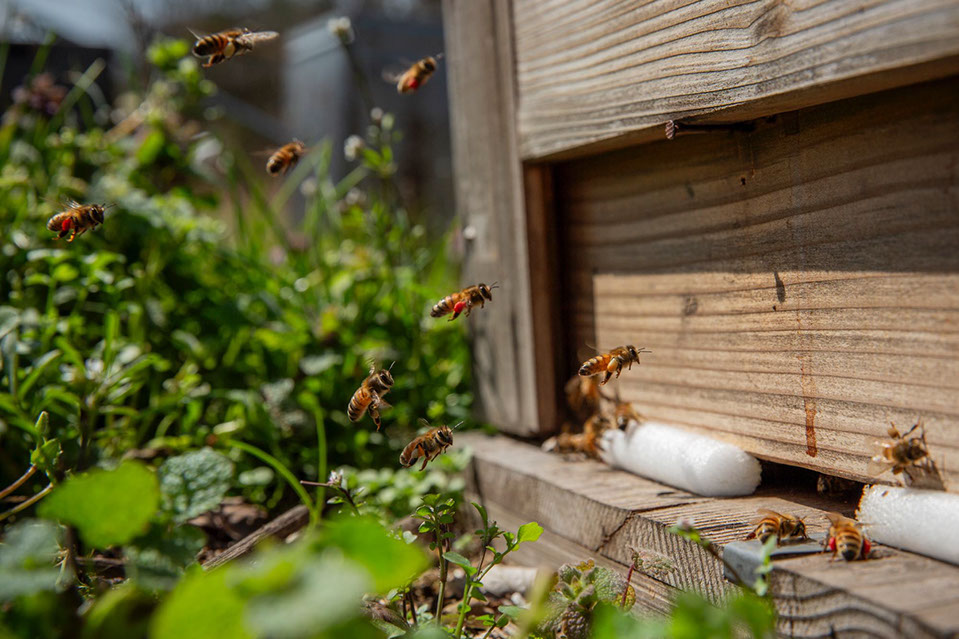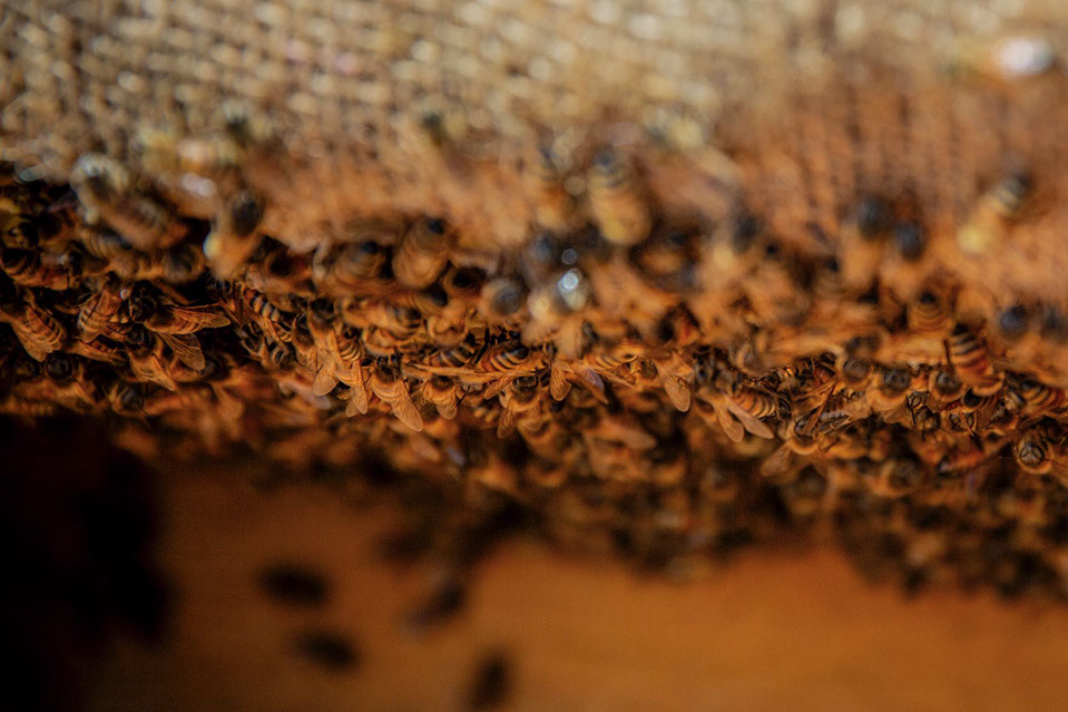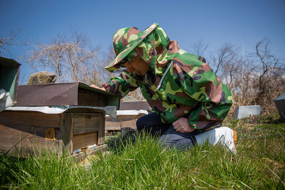 「以前はスーパーの魚屋やったんです。スーパーが休みのたんびに『採蜜やから手伝って』と駆り出されて……。僕のスーパーの仕事は火曜と金曜が休みだったんだけど、火曜に手伝いに行って水曜と木曜日に仕事したら、又、金曜日に『採蜜だ』と呼び出されて、僕は全然休みがなくて、子どもらと遊びに行くことも出来ずにヘロヘロになってました。27歳の時から採蜜のお手伝いに行き始めて、それから2年ほどしてスーパーの魚屋をやめて、義父と一緒に内検にも行くようになって、養蜂の一歩を踏み出したんです。蜂の仕事を手伝いながら7年間くらいは他の仕事もやっていたんですけど、義父が本来の仕事が忙しくなり、次第に養蜂の考え方が一致しない面も出てきて『一人でやるのなら、やれ』と義父は養蜂から手を引いて、3年前から一人でやることになったんです」