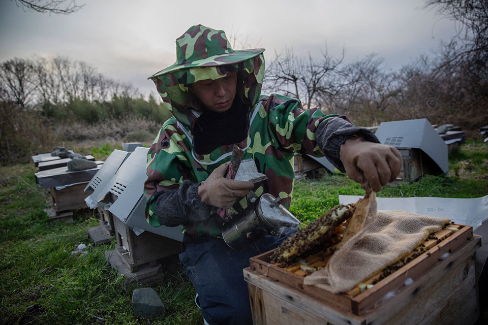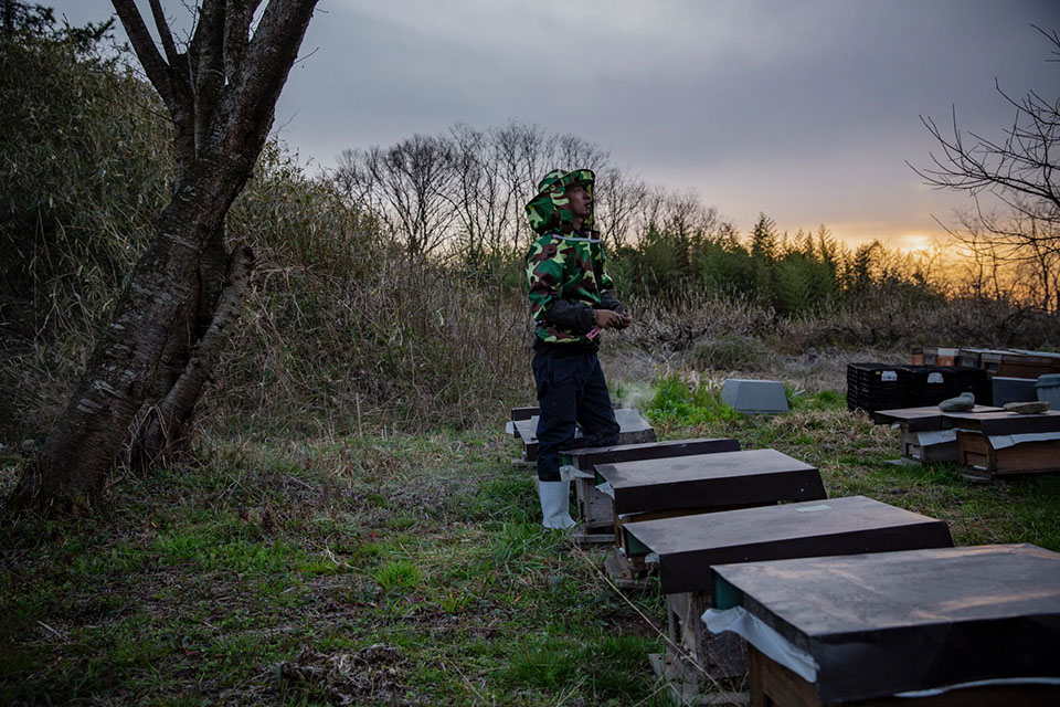 「例年だと、山の蜂場でウワズミザクラを採った後、5月8日にアカシアの(採蜜群として)浜佐美の蜂場に戻れば丁度という感じなんです。越冬明けで心配している時に、8℃くらいの気温で飛んでくれたら、ああ、(無事に越冬)出来たんやなあって安心しますね」