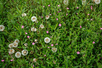 無造作に車を乗り入れようとした私に注意を促す干場さんの言葉で、放置された広場だと思っていた野原は干場さんが管理している花畑なのだと気付いた。確かに、隣接する空き地はカヤのような硬い細葉で背の高い植物が茂っているが、干場さん宅の前はクローバーやタンポポだけでなくヤグルマギクやダイコンなど小さな花が自然な感じで群れている。干場さんの細やかな手入れによって自然な雰囲気を醸し出す花畑となっているのだ。