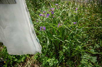 洗濯物を干してある下にムラサキツユクサの花が咲く
