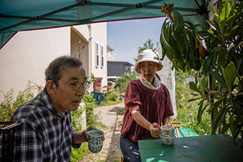 自宅庭のテント下で干場さんが淹れたハーブティーを戴く。右は妻の恵美子さん
