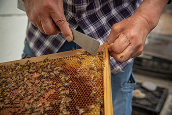 蜜を溜めた巣板上部を少し削ると、そこを蜜蜂が掃除して