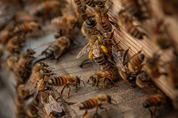 翌朝、約束の時間前に干場さんの花園を撮影していると、干場さんもカメラを持って現れた。干場さんも蜜蜂の写真を撮ることに熱心なようで、カメラの機種や機能の知識は私より豊富のようだ。お互いに足下の小さな花やダイコン、クリムソンクローバーの花蜜を採りに来ている蜜蜂を撮影していると、干場さんが独り言のように教えてくれた。