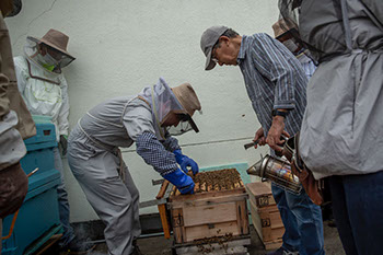 事ある度に干場さんが口にされることで、ネオニコチノイド系農薬に対する干場さんの拒否感が強いと伝わってくる。その根底には蜜蜂に限らず小さな生命に対する愛情があるのだ。ひとしきりお互いに花園の撮影をした後、干場さんが玄関脇の庭で摘んだハーブを淹れたティーをご馳走になっている時「あれっ、これアワフキムシの巣だ。最近は、昆虫を見ることが少なくなっていて、久し振りに見ました。カメムシ目の昆虫で、この泡が幼虫の巣なんですよ」と、テーブル横の植物の葉に付いた小さな泡の塊を指差して教えてくれる。「学者と言われるより養蜂家と言われる方が嬉しいです。蜂好きのおじさんであることには間違いないですね」と、庭の茂みで営まれる昆虫の生態に目が行ってしまう言い訳のようなことをボソッと口にする。しばらくすると、妻の恵美子(えみこ)さん(64)もティータイムのテーブルに加わった。「保護犬を2頭預かって飼っていましてね。昨夜、粗相をして……」と物干しにシーツが干してある。恵美子さんも中学校の理科の教師として勤めていたとのことだ。おふたりの馴れ初めは聞きそびれたが、保護犬を預かっていることでも分かるように、生き物への愛情の深さがおふたりを結んだのだろうと想像してみる。