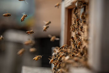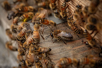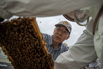 昼食の後、干場さんが世話をしている養蜂場へ連れて行ってもらえることになった。坂戸市内なのだが場所は明確にできない。到着して驚いた。養蜂場はコンクリート造り建築物の屋上だ。屋上に上がってドアを開くと、すぐ目の前に継ぎ箱になった巣箱が5箱と単箱が1箱並んでいる。2段だが間に脱蜂板(脱蜂器を付けて蜂が上の段から下への一方通行になる装置・インナーボードともいう)を挟んであるため蜂が居なくなっている継ぎ箱を外して、干場さんが巣箱の内検を始めた。すると、すぐに「女王が誕生していますね。生まれて1日目か2日目、未交尾です」と声を掛けてくれた。見ると、働き蜂よりは一回り大きな体で胸部が黒くて大きく胴体の長い女王蜂が群の中を歩いている。ビーッ、ツ、ツ、ツ、ツと何かの小さな音が聞こえた。「クイーンパイピングですよ」と、干場さんが少し驚いた様子でつぶやく。「未交尾の新女王が鳴いているんです」。再び、ビーッ、ツ、ツ、ツ、ツと唇を閉じて細かく震わせた時に出るような音が小さく聞こえる。新女王が鳴いている間は、周りにいる働き蜂がその声に聞き入るように一斉に動きを止めているのが印象的だ。