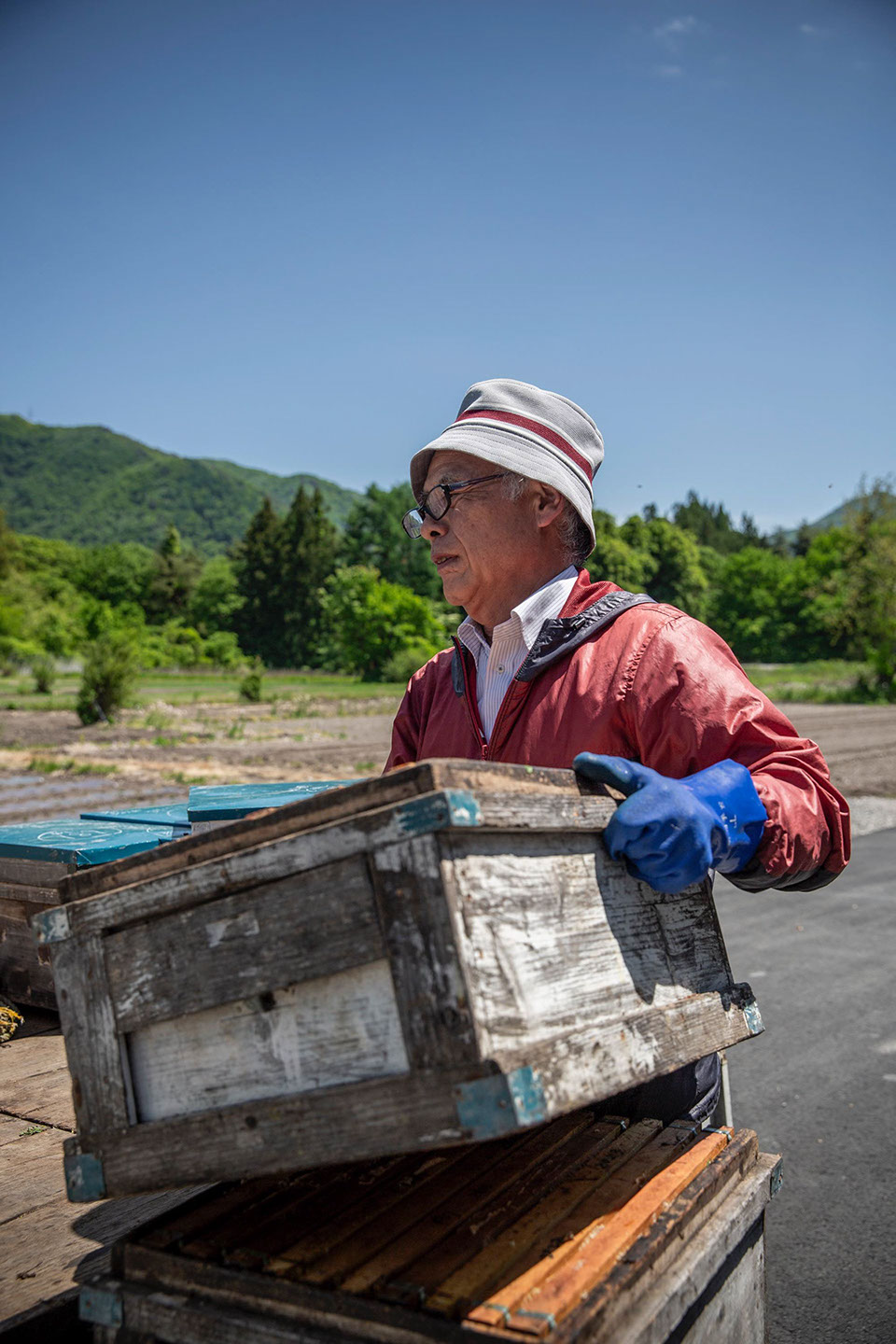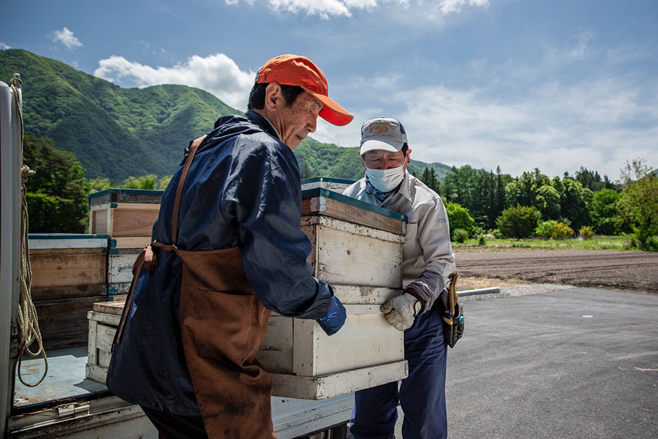 搬入口に蜜巣板を積んだ軽トラックが横付けされると、採蜜工場責任者の金子裕(かねこ ゆたか)さん(70)が荷下ろしを手伝っている。金子さんは豊さんが以前勤めていた地元銀行関係の仲間だ。つまり気心の知れた古くからの友人という訳だ。蜜巣板が搬入される様子を見ていた豊さんが少し嬉しそうに言う。