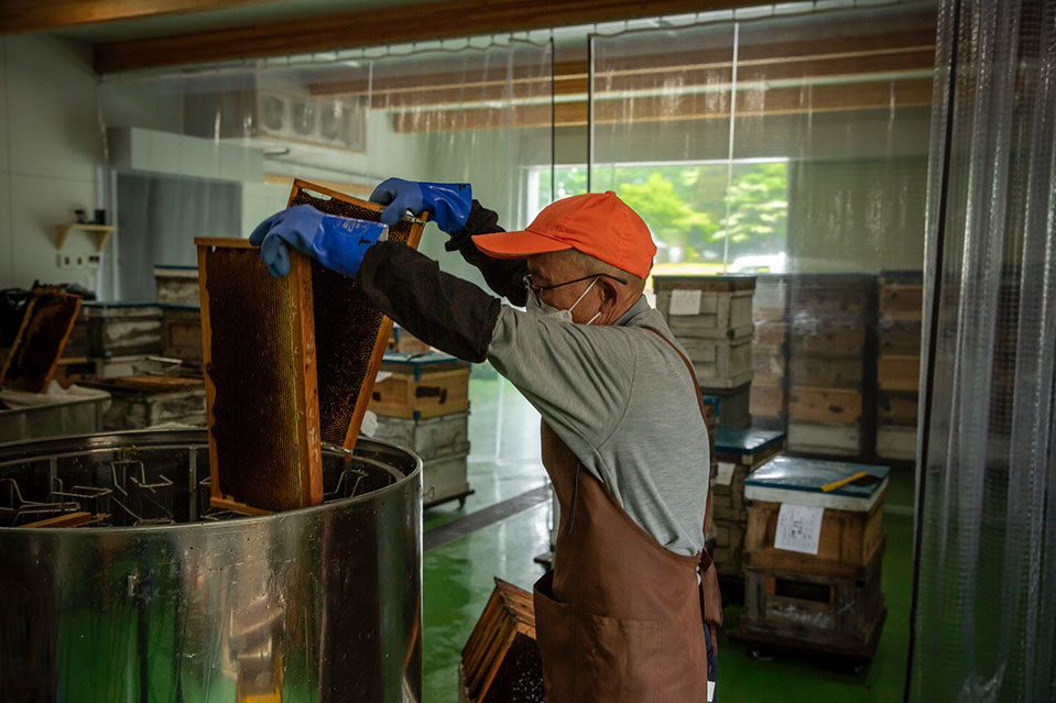 採蜜工場で蜜蓋を切る包丁を温める和田保さん