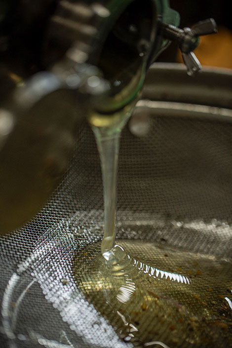 金子さんが遠心分離機で搾った蜂蜜を漉し器に入れる
