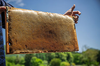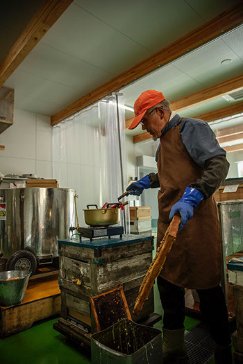 こう説明した後、周さんは黙々と内検を始めた。周さんの作業はゆっくりと丁寧で静かだ。同じような動作を繰り返す。時折、六角形の巣房の底を覗き込むように巣板に目を近づけたり、覗き込みたい巣房の前に蜂が居たりすれば「フッ」と息を吹き掛けて蜂を移動させたりしている。緊張感が漂い声を掛けるのも憚(はばか)られる。
