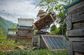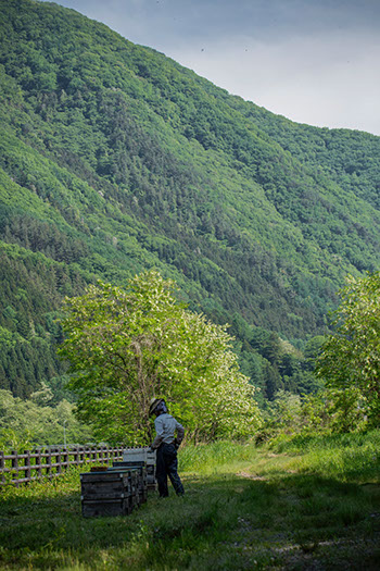 「巣箱の中で蜂をどう動かそうとしているかが、社長とぼくとは違いますからね。自分は巣箱を開けて群全体がどの方向へ向かおうとしているかを読み取って、それを活かしてやろうとするけど……。群の勢いによっても対応は違ってくるから、あんまりフィーリング過ぎてもいけないし、だからといって蜂の意向も読み取らなきゃいけないし……。蜂の圧というか、勢いと集り方、動き、巣の色とかで判断するんですけどね」