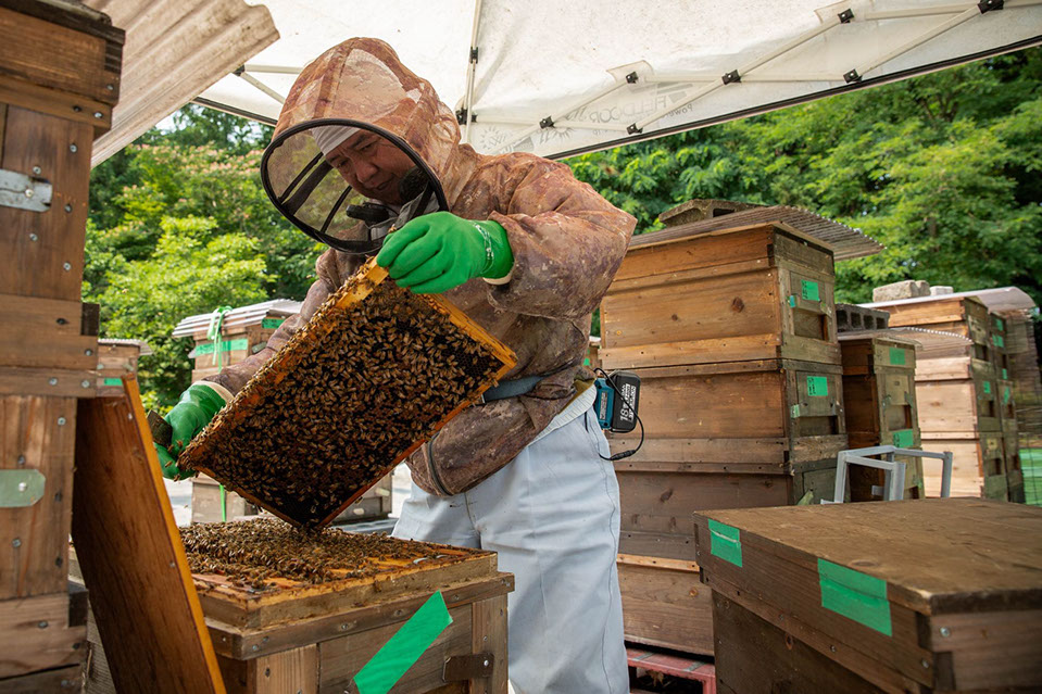 「巣箱は4段にした方が蜂蜜は美味しいと思うんです。最初、蜂は蜜を1段か2段に溜めるでしょうから、上に持っていった蜂蜜は蜂たちの手が掛かっている訳ですよね。何をやっているか分かんないけど……。日中、キラキラした蜜が入っているのが分かっているけど、3段4段の巣板を見ると、みんな頭を巣房に突っ込んで何かやっている。ジーッと動かないからね。何やっているのか分からないけどね。蜜を搾る時は、蜂の手が掛かっている3段と4段の蜜巣板だけしか搾らないんです」