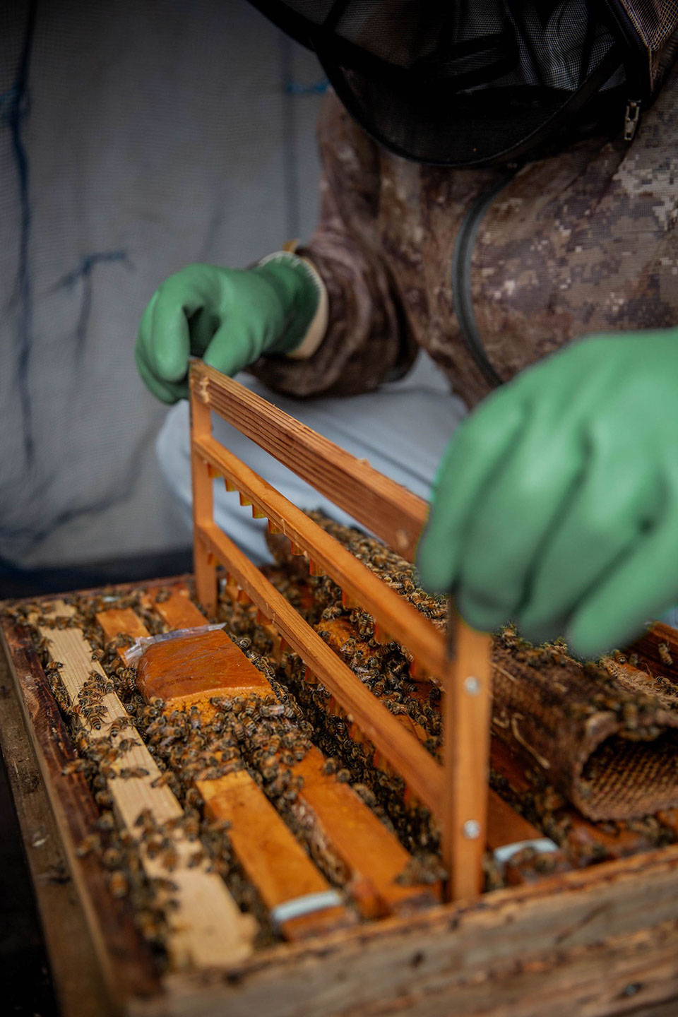 昼食を済ませて簗場養蜂場に到着すると、簗場さんは休憩時間も取らずに昨日途中で止めた内検の続きを始めようとしている。「今日の内検の目的は王台が出来ているか、いないかを確認する作業ですね。分封をさせて蜂が居なくなってしまうと困るから、王台を取りまくっているからね。色々なパターンがあるけど、王が働き蜂に殺されていたりするので、そんなのを確認して、現在の群数を維持するようにしているんです。群数を増やすために割り出しはしないんですよ」。