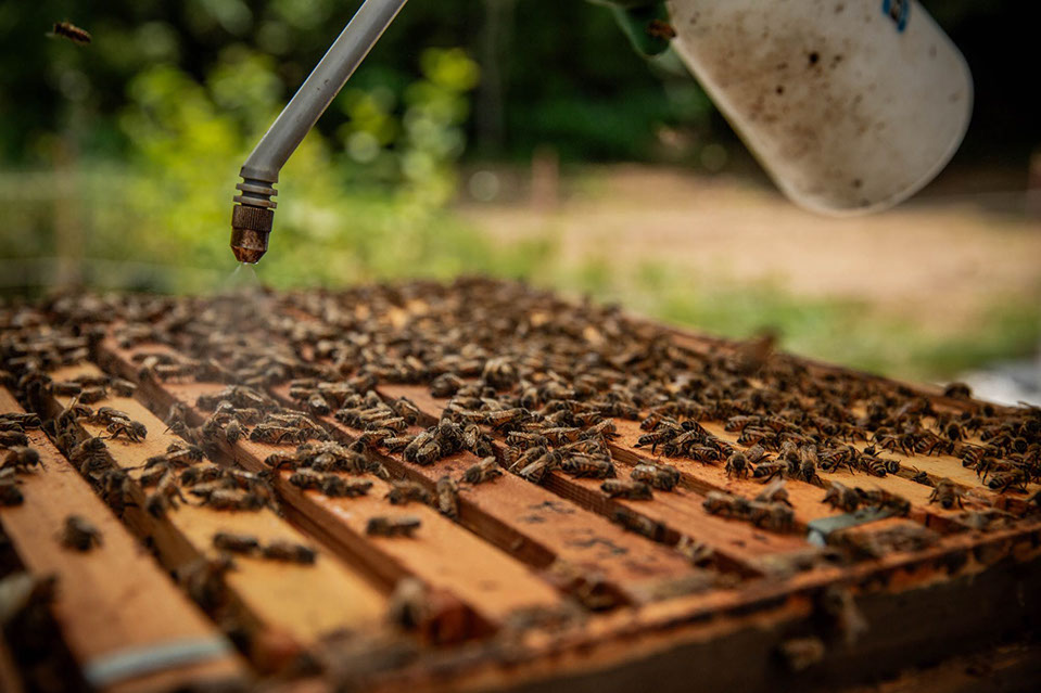 卵や幼虫のいる1段目と2段目の巣板にBKC液を噴霧する