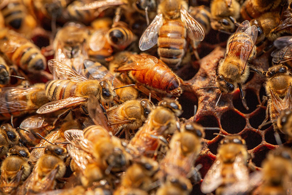 「新女王蜂のお尻に白い物が」と簗場さん。交尾から帰ってきたばかりのようだ