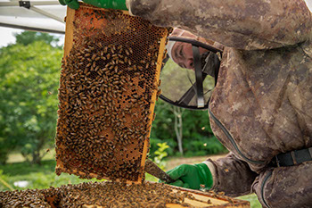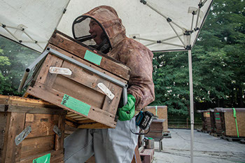 蜂場の中には太陽をさえぎる樹木がないため、簗場さんは、引っ張ればすぐに移動できる簡易式テントを張って、その下で作業をしている。「テントを使い始めたのは最近ですよ。すごく気持ちがいいです」と快適そうだ。