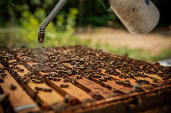 「前回の内検で、この群は新女王を見たんですよ」と、簗場さんが女王蜂を探す。「蜂数も少ないな」と呟く。「飛んで行ったかも知れないな」と、分封した可能性もありそうな口ぶりだ。一群、一群の内検を終える直前に簗場さんはBee Keep-Cと呼ぶ有機酸発酵食品の水溶液を巣枠の上から噴霧している。「蜂児が居る所だけにBKCを掛けているので、1段目と2段目だけですね。電解水よりこっちの方が良いです。蜂の腸内環境が良くなってダニにも効くそうですよ」と簗場さんが説明する。その後で「ビショビショで動けなくなってる」と呟いた言葉に、小さな命へ向ける眼差しに優しさを感じた。