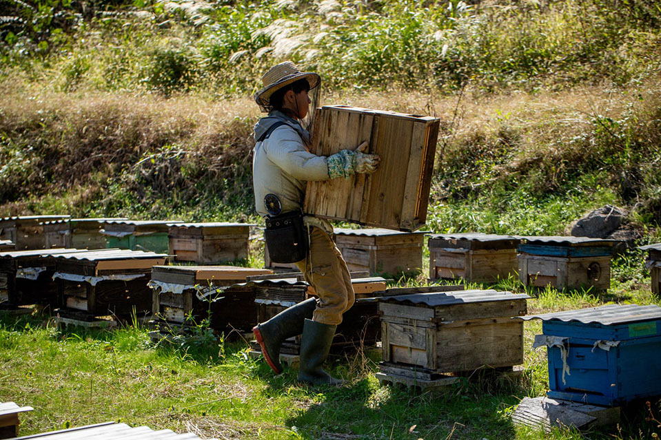 蜜巣板を取り出した継ぎ箱を力斗さんが運ぶ