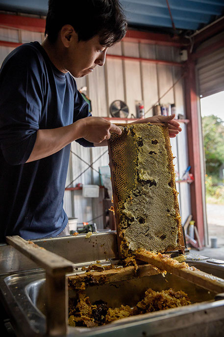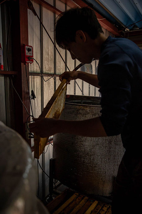 午後一番に事務所を訪ねると、すでに蜜蓋切りは終わりそうで「あと2枚ですよ、早く写真撮らないと……」と力斗さん。力斗さんはいつも何かに追われるように急いでいる。次々と仕事をこなしていくことが、力斗さんの仕事に対するモチベーションの維持にも繋がっているのだろう。蜜蓋切りはすぐに終わり、遠心分離機が回転を始めた。この日の採蜜は、朝のうちに巣箱から抜いてきたアレチウリの蜜巣板だけだったようだ。人工餌を与えないはけた養蜂場にとって、この蜜は来年の春に活動を始めようとする蜜蜂たちの建勢の餌として重要な役割を果たすことになるのだ。