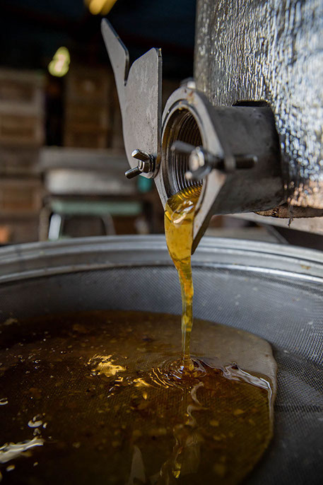 遠心分離機で搾った蜂蜜が漉し器に流れ出る