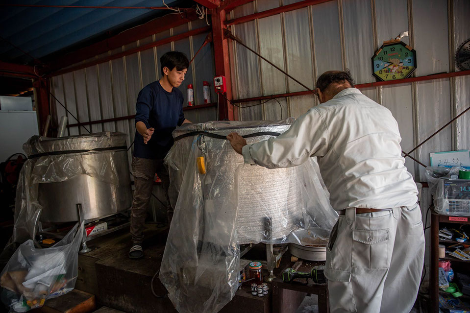 搾った後の蜜巣板を力斗さんが遠心分離機から取り出す
