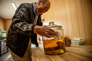「この辺、松茸の産地なんですよ。隣の青木村の道の駅には、朝の売り出しを待って300人くらい並ぶんですよ」と、はけた養蜂場初代の羽毛田慶助(はけた けいすけ)さん(82)が、500グラムもある大きな松茸をアルコール漬けにした保存瓶を私に見せる。「自分は(松茸採りを)50年ぐらいやっているんですよ」。