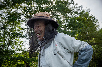 小牧蜂場では特に作業はしないまま、軽トラで小径をさらに奥へ移動すると、ほんの1、2分で小牧奥と呼ぶ蜂場に到着だ。100群ほどの巣箱が置いてある。ここでは軽トラを降りることもなく、巣箱の間を軽トラで走り抜けた。「できるだけ巣箱の近くまで車で行けるように、巣箱の列の間隔を空けているんです」。労働の軽減化に積極的な様子が伝わる。