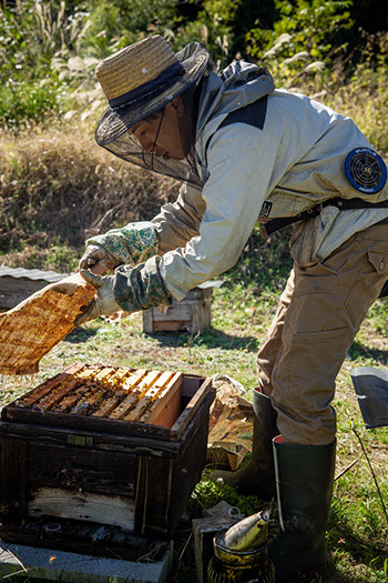 力斗さんは前もって調べておいたアレチウリの蜜で圧迫している蜜巣板を抜き出して、継ぎ箱に集めている。「ここら辺の巣箱も圧迫がひどいんですよ。蜂児がこれしかないですから」と、蜜蓋が掛かった巣板を抜き出して私に見せる。場所によってはダニ駆除剤のアピバールを差し込んだ巣箱もある。「ここら辺だけはアピバールを入れているんですけど、他には入れてないんですよ……」と、ちょっと私が巣箱の中の写真を撮るのを気にしているようだ。できるだけダニ駆除剤は使いたくないという気持ちが伝わってくる。「今年はだいぶ(ダニを)落とせてはいると思うんだけどな」と、呟いている。