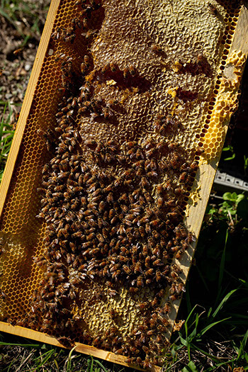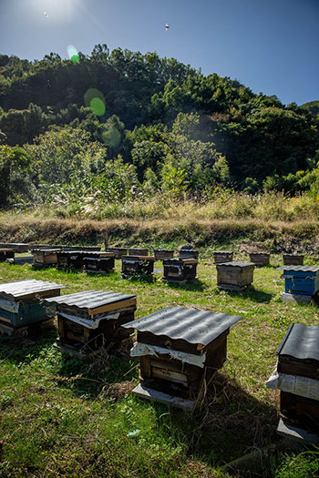 蜂場の片隅に積み上げてある継ぎ箱に入れておいた巣枠を持ち帰ると言う。「9月にソバ蜜を搾った後の巣枠なんです。ソバ蜜は匂いが強いんで蜂に掃除してもらうために継ぎ箱に預けておいたんですよ」と、私の疑問に答える。もう一つ疑問があった。内検を終えた巣箱の巣枠の上を覆うドンゴロスとハトロン紙を、力斗さんは並んだ巣枠の半分だけに被せている。「今の時期はダニを駆除するために殺ダニ剤をするので、巣枠の半分は開けておくんです」。一つ一つの作業に理由があるのだ。「今年も350群という数がありながら、ダニによってその数を減らしてないので、今のところ成績は良いですね。ダニを落として、どれだけ蜂の数を減らさないで済ませるかが、今の時期の課題ですね」。