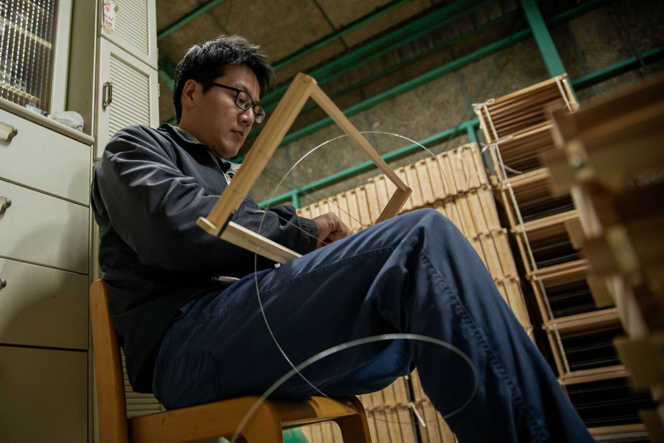 蜂場での内検が終わった後、倉庫で山田淳一さんが巣枠に針金を通す